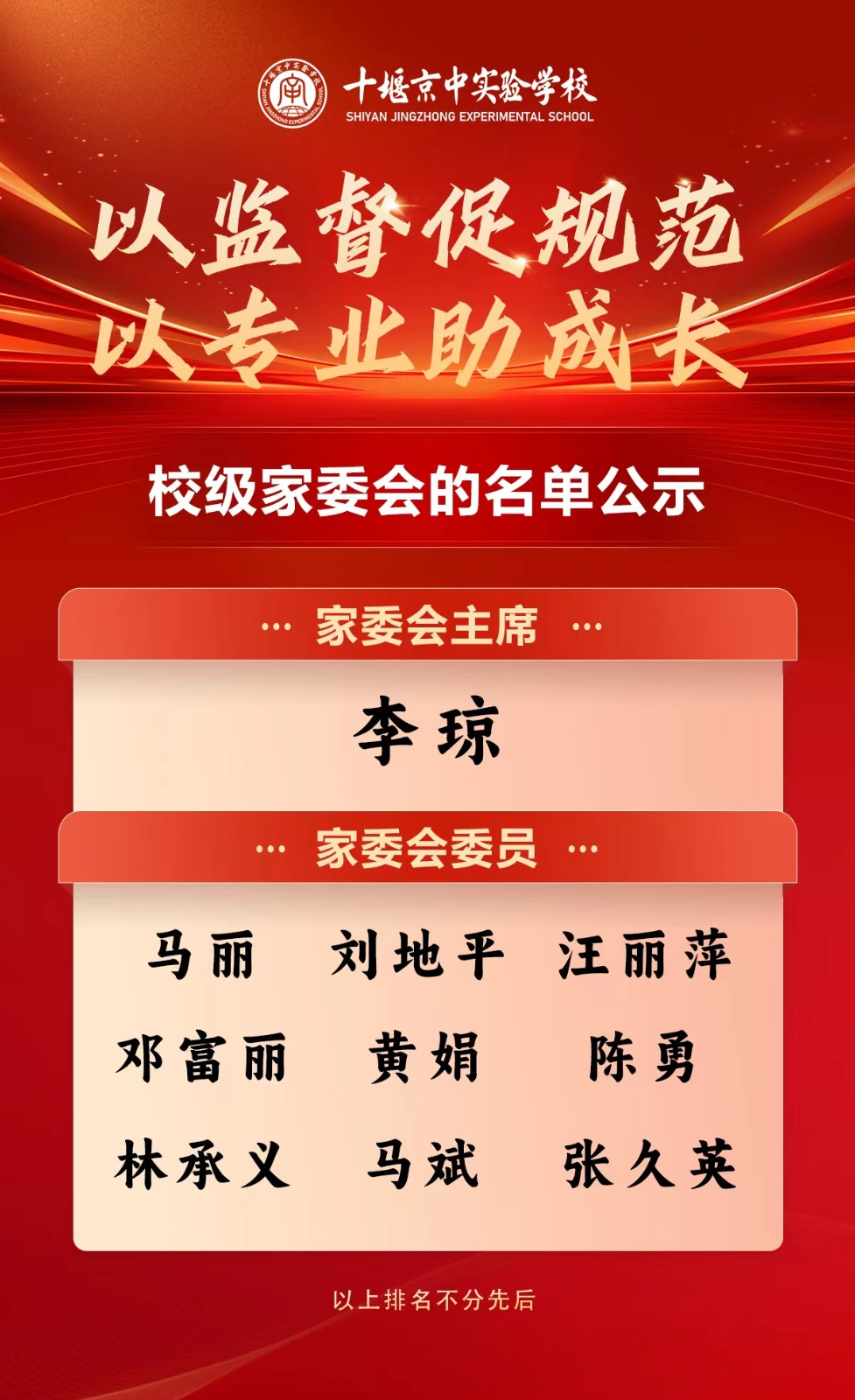 相信在新一届校级家委会的努力下,京中实验学校的家校合作将迈上新台阶,为孩子们营造更优质的成长环境。在此,衷心感谢各位家长对学校工作的大力支持与无私奉献!
