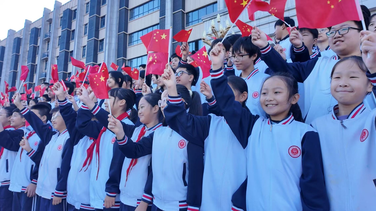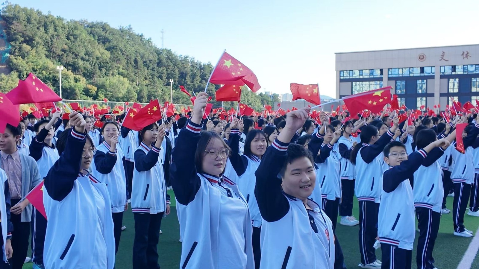 师生们挥动手中的小国旗